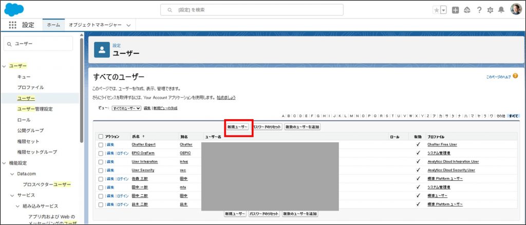 ③ユーザーの設定画面が表示されますので、画面中央にある「新規ユーザー」をクリックします。
