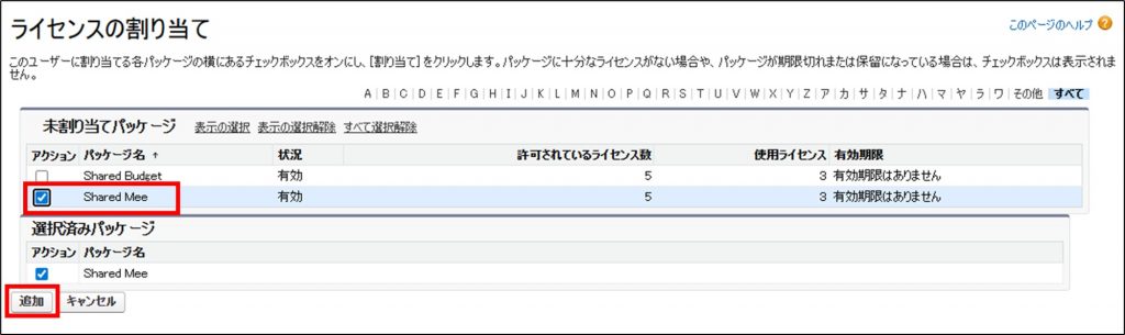 ②Shared Meeのアクションにチェックを入れ、「追加」ボタンをクリックします。