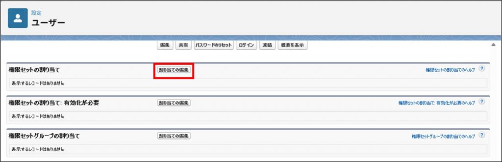 ④画面を下方にスクロールして、権限セットの割り当て欄にある「割り当ての編集」をクリックします。