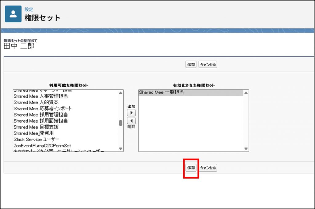 ⑥有効化された権限セットに追加したら 「保存」ボタンをクリックします。