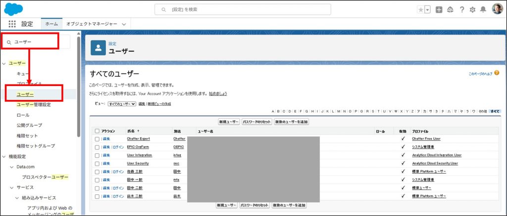 ②設定画面の左側に表示されるクイック検索欄に「ユーザー」と入力して、下段に表示される「ユーザー」をクリックします。