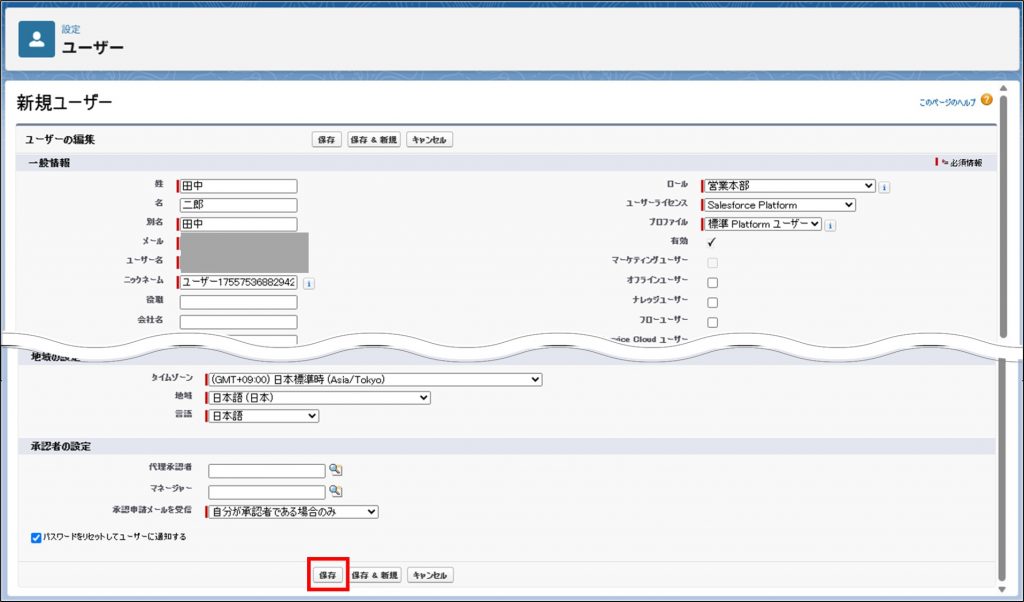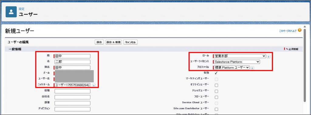④新規ユーザーの設定画面が表示されますので、必要事項を入力します。(入力欄の左端に赤いラインがある項目は入力必須となります。)