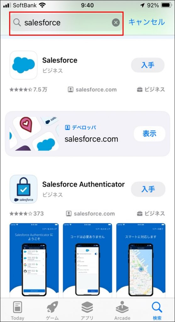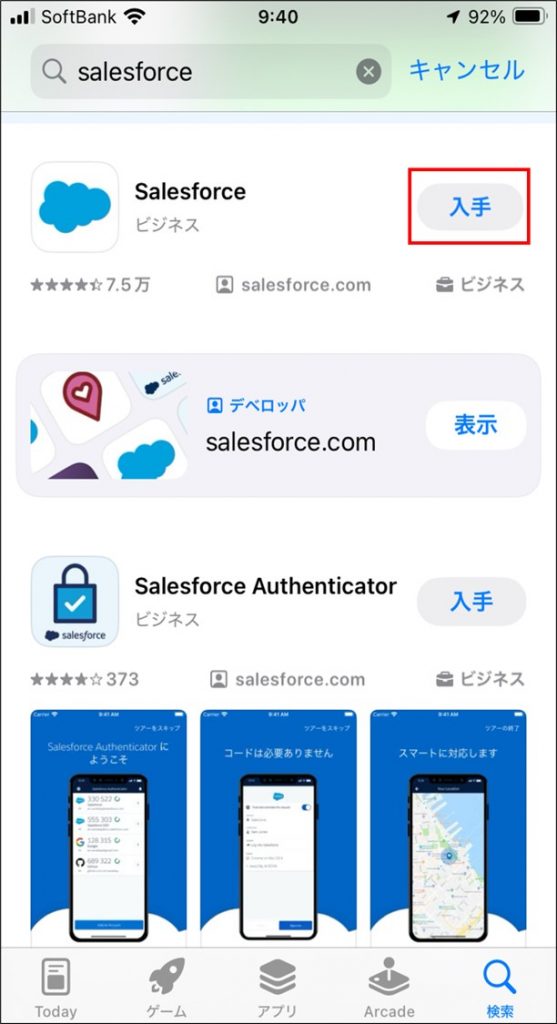 ④提供元がSalesforce.comであるSalesforceアプリであることを確認し、アプリの右側にある「入手」をタップします。