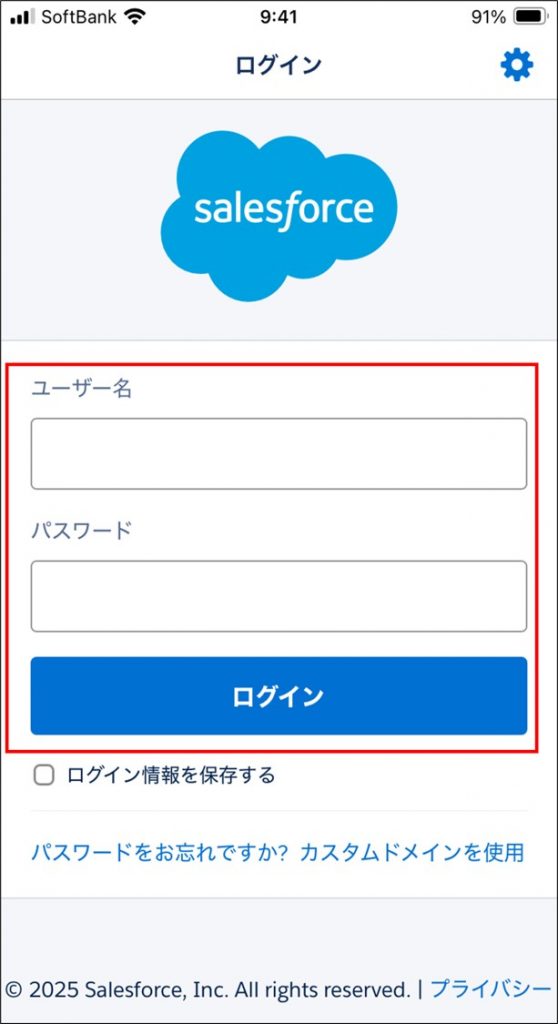 Salesforce Appを起動し、ご自身のIDとパスワードを入力してログインします。
