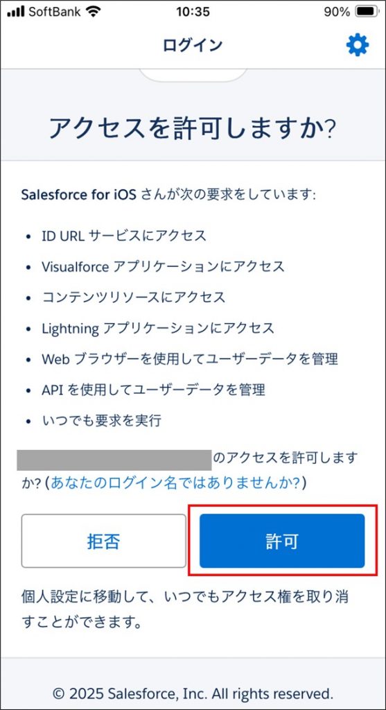 上記画面は、お客様がご利用になるSalesforceモバイルアプリケーションが、お客様ご自身のユーザーアカウント情報(氏名、メールアドレスなど)へ安全にアクセスすることをシステムとして許可するかどうかを確認する重要なステップです。