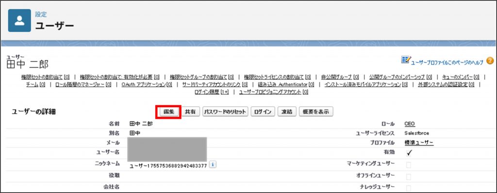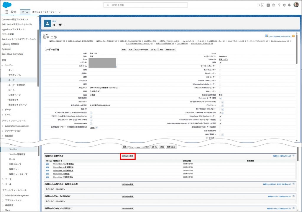 ④退職者のユーザー画面が表示された後、画面を下方にスクロールして「権限セットの割り当て」欄にある「割り当ての編集」をクリックします。