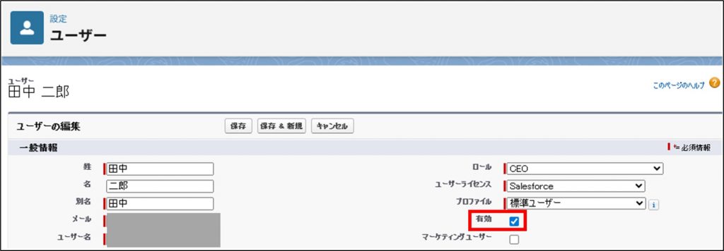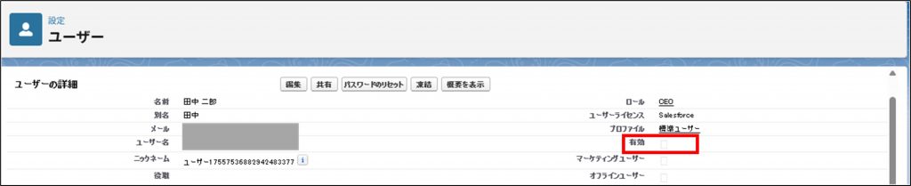 ②ユーザーの編集画面にて「有効」項目のチェックを外してください。