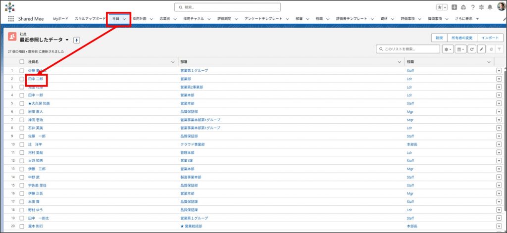 ①Shared Meeの社員タブから退職社員の社員名をクリックします。