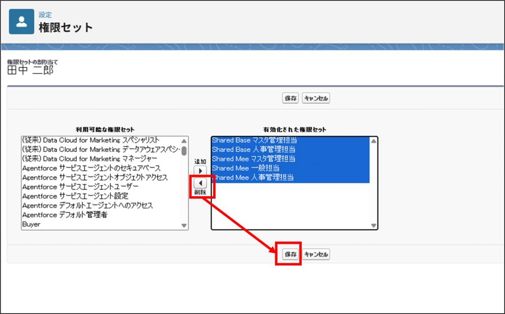 ⑤割り当ての編集画面にて、「有効化された権限セット」に設定されている「Shared Mee」および「Shared Base」の権限セットを選択し、◀(削除)をクリックして「利用可能な権限セット」に戻した後、「保存」をクリックします。