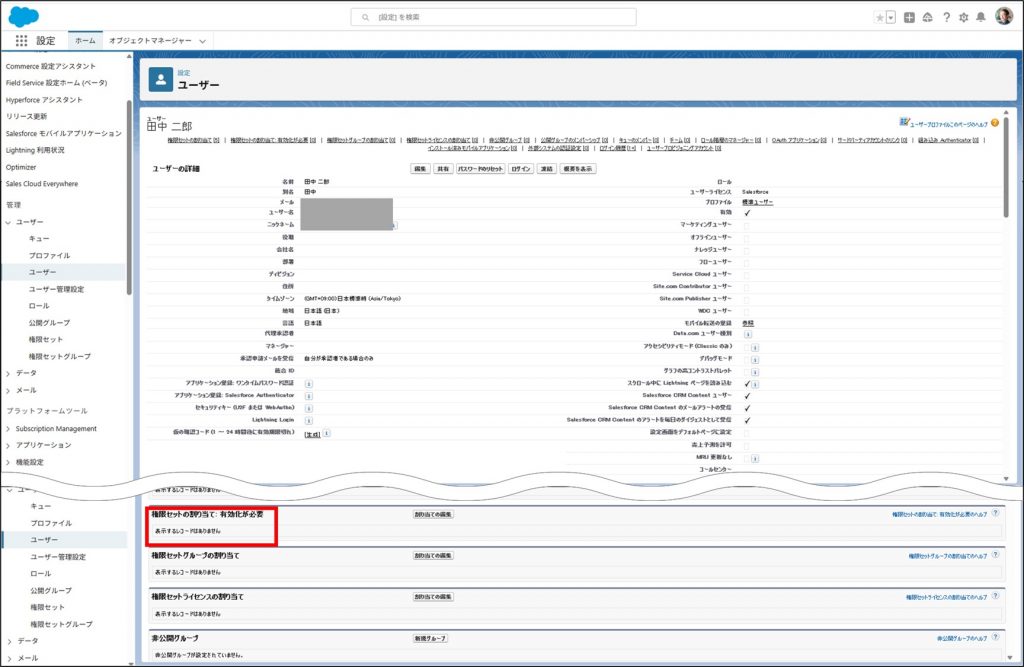 ⑥権限セットの割り当ての削除が終了すると、退職社員のユーザー画面に戻ります。権限セットの割り当て欄に「Shared Mee」および「Shared Base」の権限セットが表示されていないことを確認してください。