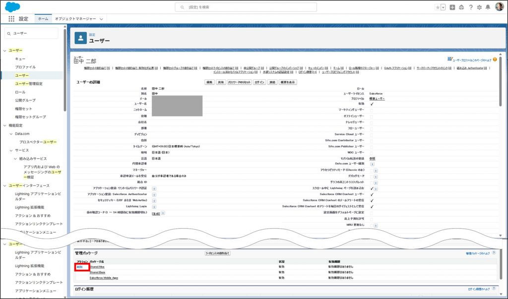 ①退職者のユーザー画面を下方にスクロールして、管理パッケージ欄にあるShared Meeのアクションの「削除」をクリックします。