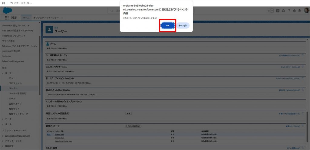 ②「このパッケージのライセンスを削除しますか?」とポップアップが表示されますので、確認して「OK」をクリックします。