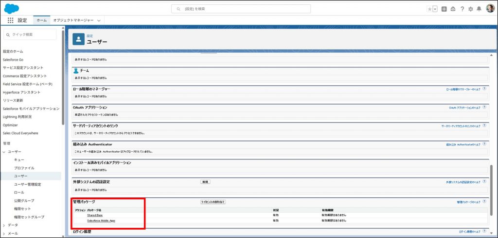 ③Shared Meeの削除が完了したら、退職者のユーザー画面の管理パッケージ欄に「Shared Mee」が表示されていないことを確認してください。