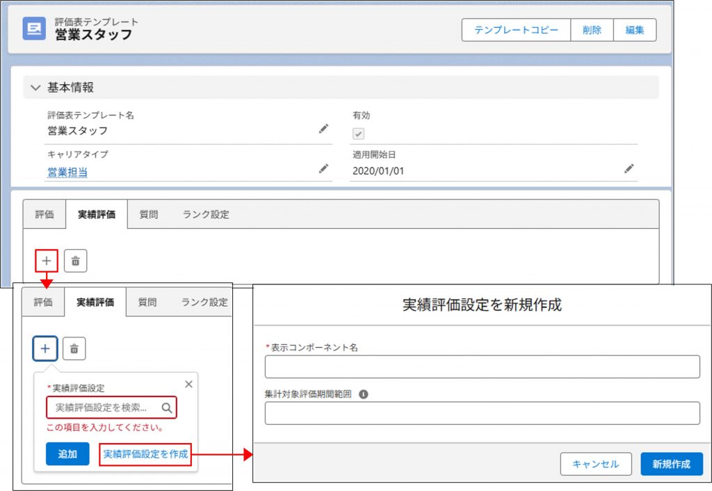 「実績評価設定」タブから実績評価設定をあらかじめ作成しておくと「評価表テンプレート」の実績評価設定で選択可能になります。