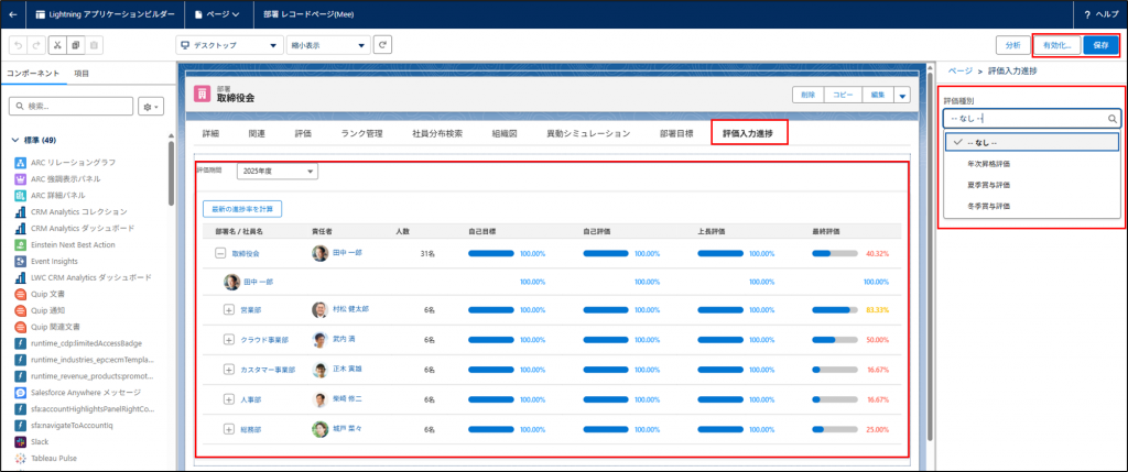 ⑦「評価入力進捗」タブを選択し、「評価入力進捗」コンポーネントをクリックして、右側の評価種別を設定します。設定が完了したら、「保存」を選択します。