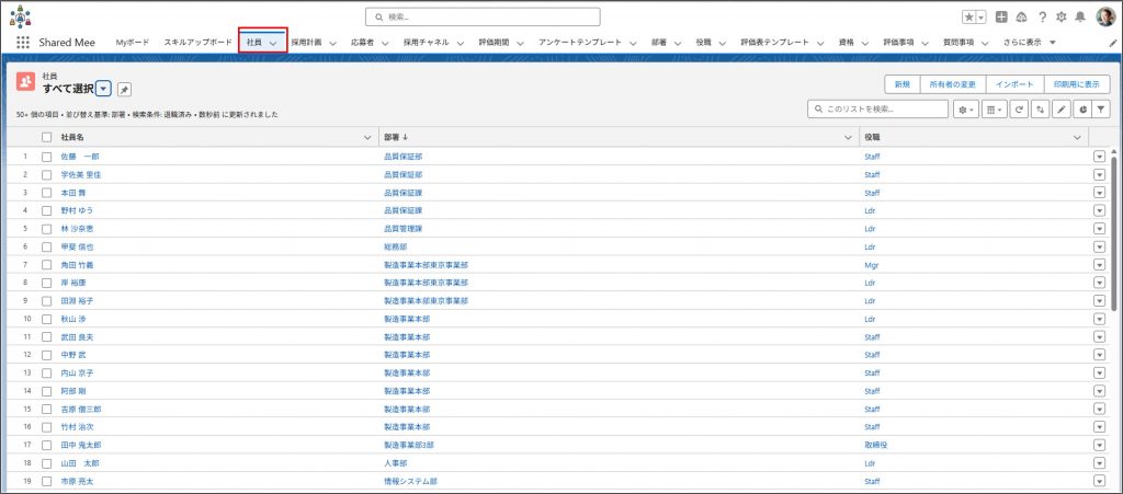 ②Shared Meeの「社員」タブから社員名をクリックします。