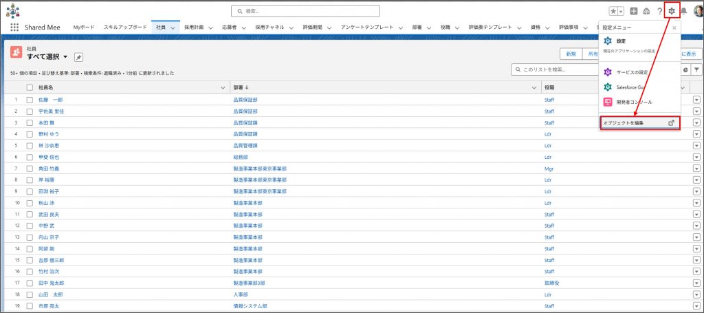 ②社員画面の右上の歯車マークから「オブジェクトを編集」をクリックします。