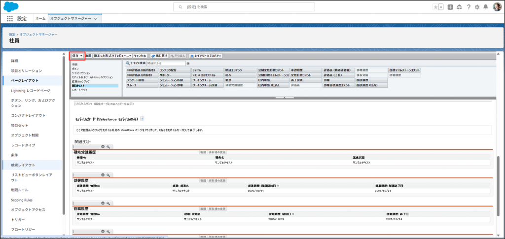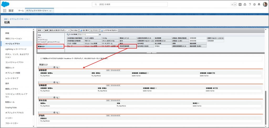 ④ページレイアウトの上部にある関連リストを選択して、関連リスト名の「研修受講履歴」を画面下部の関連リストへドラッグアンドドロップして移動します。