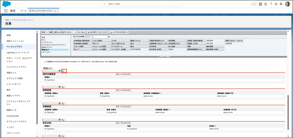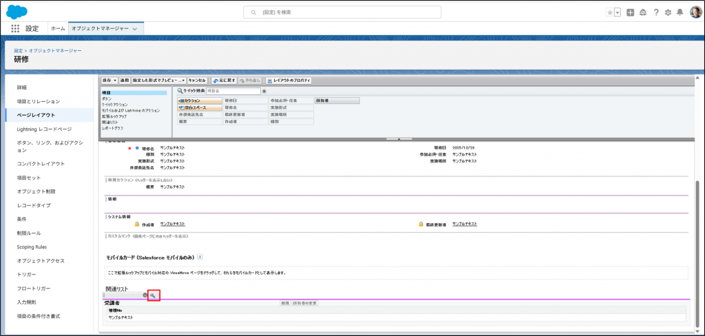 ⑨ページを編集画面の右側に表示される関連リストにて「研修受講履歴」を選択します。