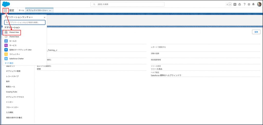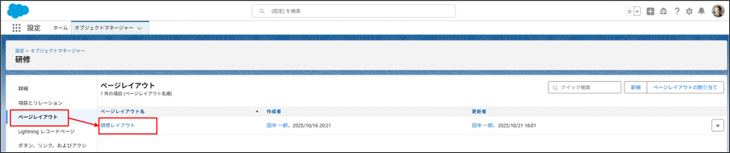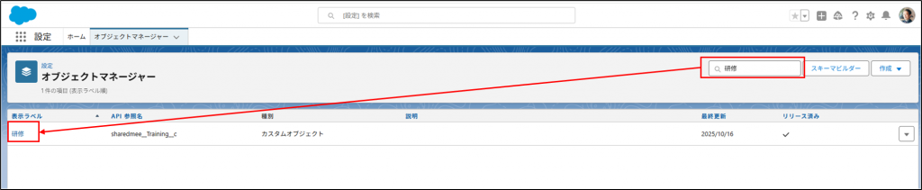 ②オブジェクトマネージャーの右上にある検索窓に「研修」と入力して検索し、表示ラベルに表示される「研修」をクリックします。