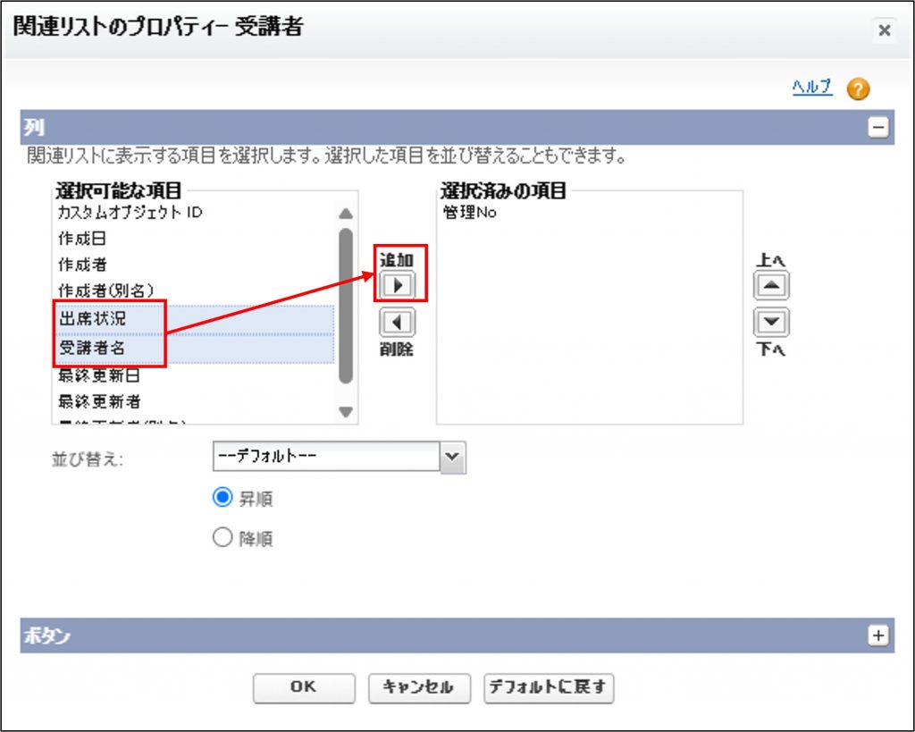 ⑤選択可能な項目から「出席状況」と「受講者名」をそれぞれ選択して、「追加」をクリックします。
