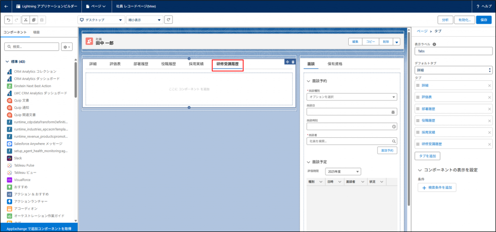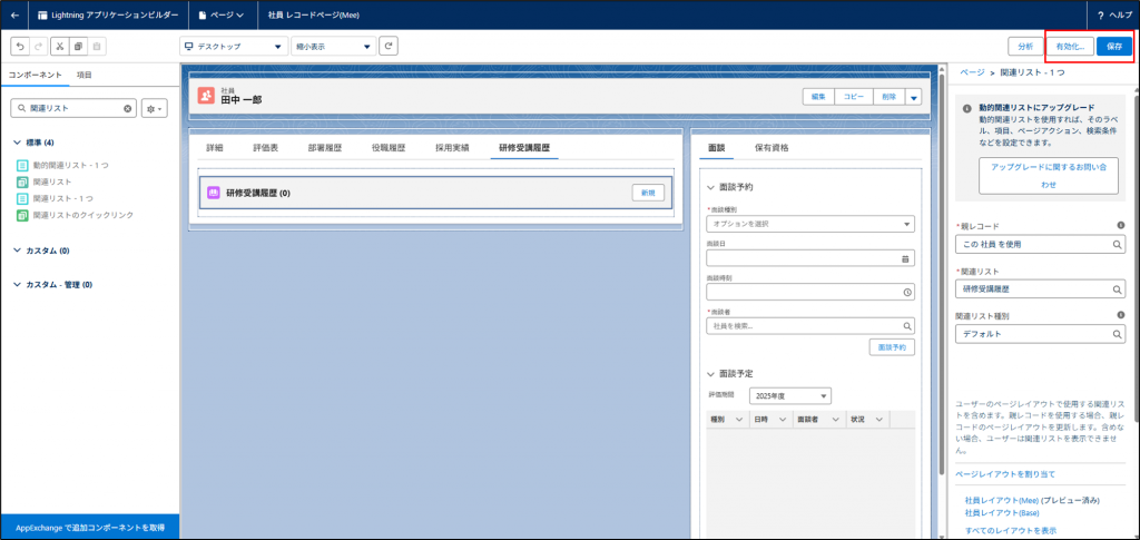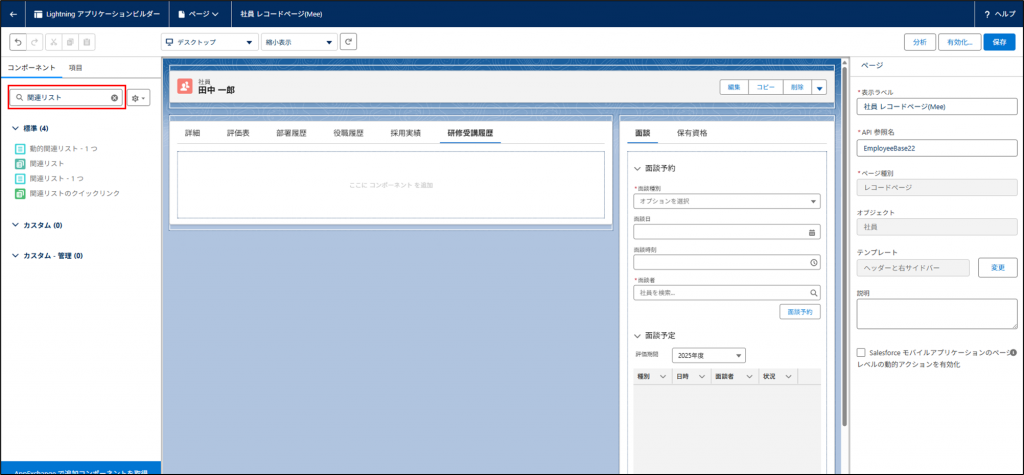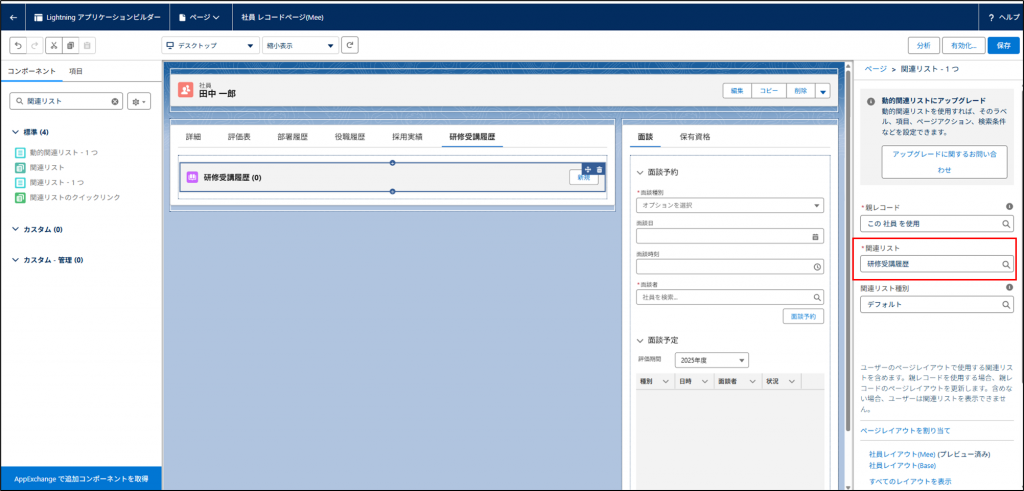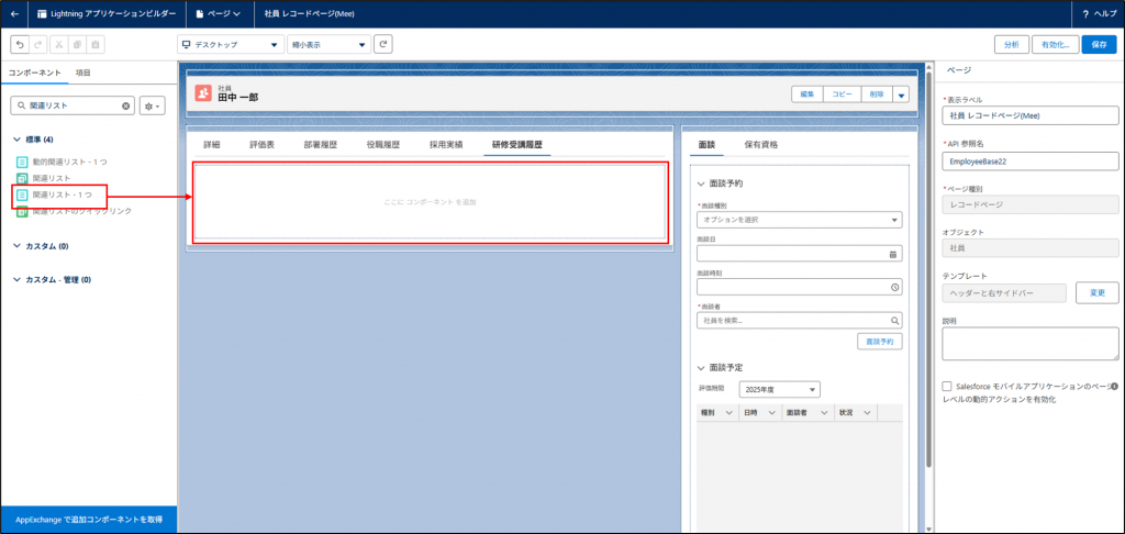 ⑧ページを編集画面の左側に表示される標準欄ある「関連リスト – 1つ」を選択して、研修受講履歴の下にドラッグ&ドロップでコンポーネントを移動します。