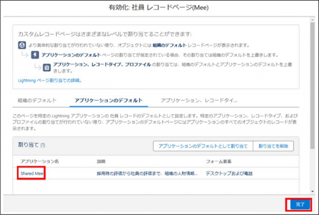 ⑪「アプリケーションのデフォルト」タブを選択し、Shared Meeが割り当てられていることを確認後、「完了」をクリックします。
